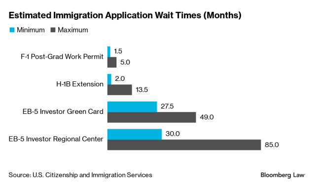 Applications to be classified as a regional center—an investment vehicle under the EB-5 immigrant investor program—are now taking anywhere between 30 and 85 months to adjudicate, per USCIS calculations. A foreign investor seeking a green card through the EB-5 program is looking at a wait time of between 27.5 and 49 months.