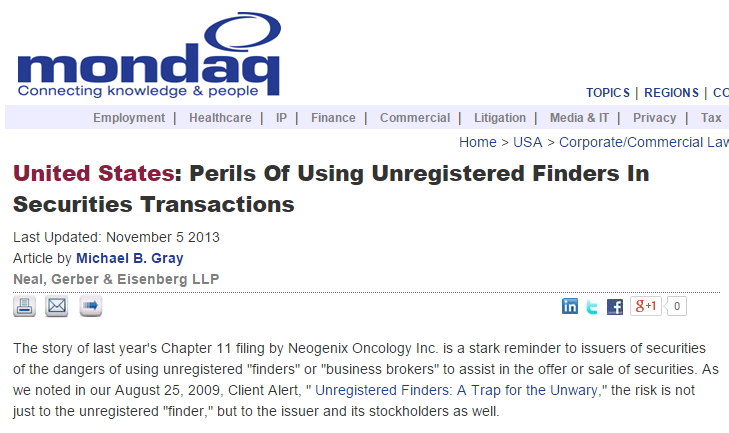 The story of last year's Chapter 11 filing by Neogenix Oncology Inc. is a stark reminder to issuers of securities of the dangers of using unregistered "finders" or "business brokers" to assist in the offer or sale of securities. As we noted in our August 25, 2009, Client Alert, " Unregistered Finders: A Trap for the Unwary," the risk is not just to the unregistered "finder," but to the issuer and its stockholders as well.