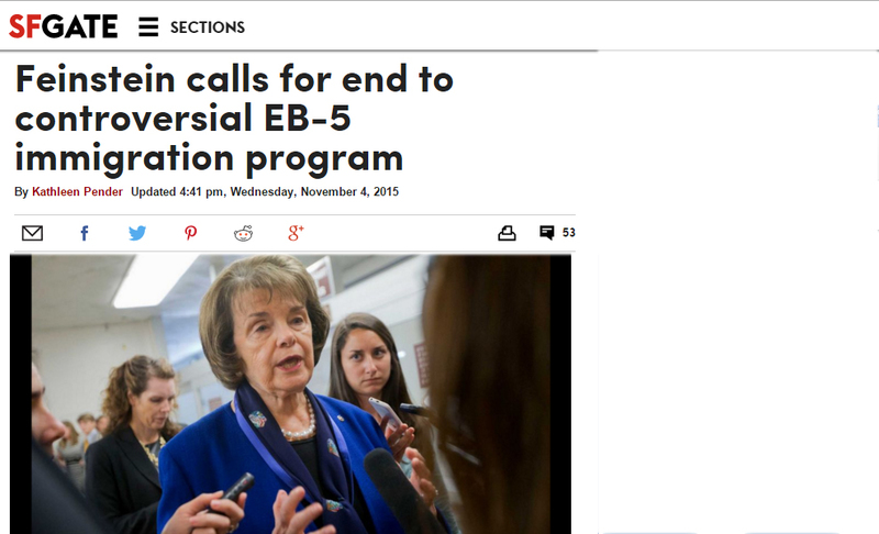 Sen. Dianne Feinstein has called for an end to the controversial EB-5 regional center program that lets foreign nationals get green cards for themselves and their families if they invest at least $500,000 or $1 million in a U.S. business that creates or preserves at least 10 jobs.